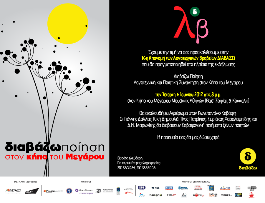 Πρόσκληση για την 16η Απονομή των Λογοτεχνικών Βραβείων ΔΙΑΒΑΖΩ